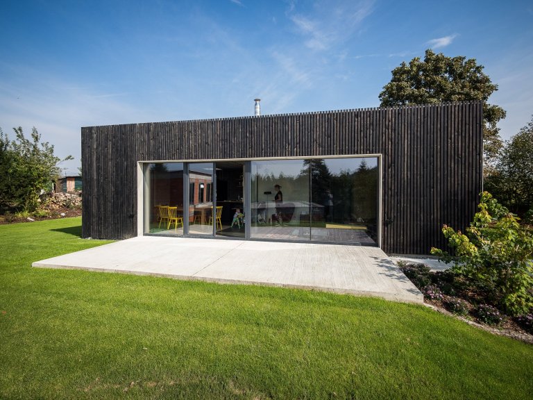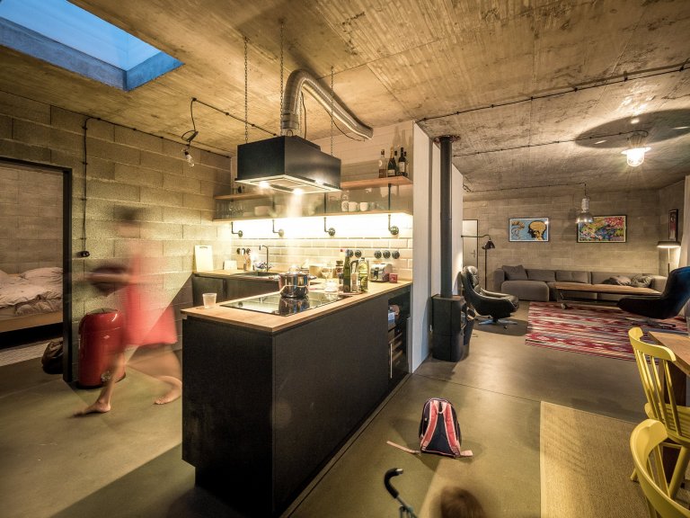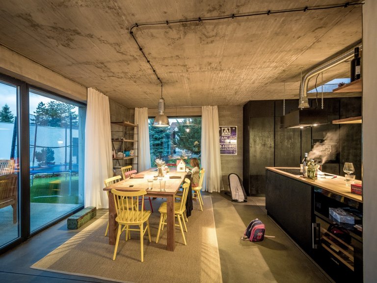 ZENHOME kousek od Prahy je na skvělém vyvýšeném místě uprostřed zeleně. Strohý kvádr zdobí fasáda z černého nehoblovaného dřeva a velké prosklení s bezrámovými skly. Dům doplňuje malá přístavba vstupní haly v bílé omítce, pochozí plochy z protiskluzného betonu a ocelové průmyslové schodiště na střešní zahradu. Interiér je ve výrazném industriálním stylu, všechny plochy domu tvoří různé formy betonu s divokými texurami, rozvody elektroinstalací jsou vedené pohledově po stěnách. Vestavný nábytek je z černých a světlých překližek. Dramatickou atmosféru domu rozveseluje jeho vybavení, které zapadá do industriálního pojetí ale přináší hravost a barvy. Se zařízením interiéru pomáhala Andrea Beranová.