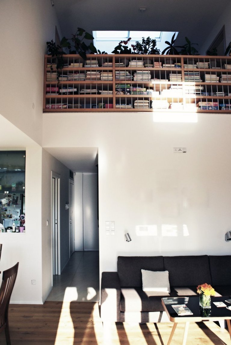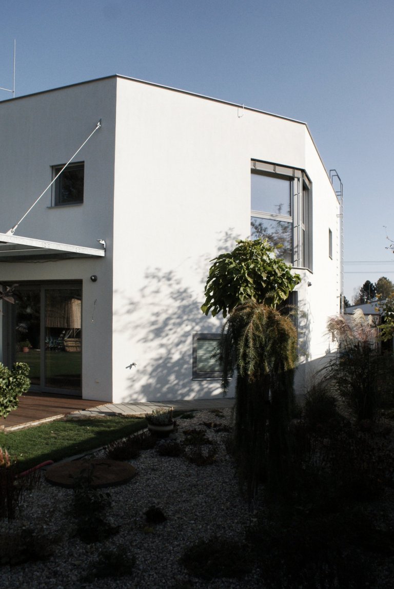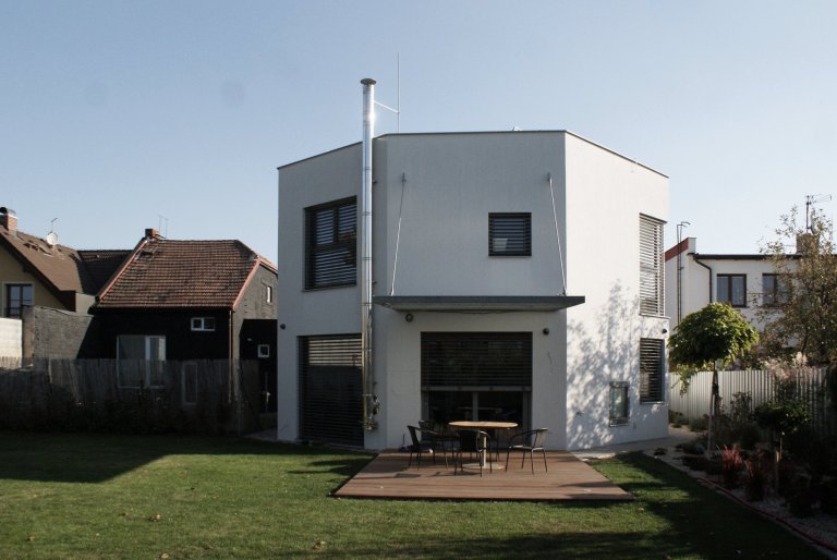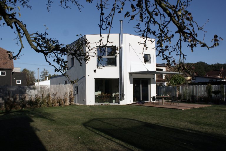 Investor přišel s již navrženým domem, aniž by tušil, kde jsou jeho potřeby a kolik vyrýsovaná investice bude stát. No, vyšel by z peněz za něco, co nepotřebuje. Začalo se znovu. Pozemek byl zajímavý. Po stranách staré typové domy dělnické kolonie. Uvnitř bloku rodinných domů jsou dospělé zahrady se vzrostlými stromy. Kousek je les a někde snad i ta studánka. Od ulice je plácek a na boku garáž. Tam si děti budou hrát a o tu garáž pinkat s míčem. Občas zamávají kámošovi na ulici. Třeba se i přidá. Dům je odstrčen až za ten plácek. V hotové ulici si dovolil být trochu výjimečný: posadil se dál od uliční čáry a sedl si jak kámen-krystal do zahrady. Tak se mu v panoramatu rozbíhají pohledy do korun stromů uvnitř zahrad. Uprostřed domu jsou patra propojena točitým schodištěm, jehož pomyslná šachta proráží i střechu. Skrz vzniklý světlík je čumenda do nebe i z obýváku, jež velkoryse prostupuje do patra.